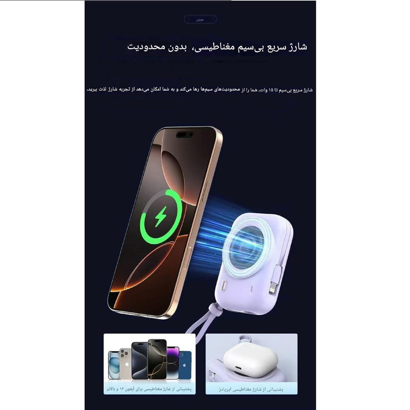 پاوربانک با طراحی خاص و زیبا به سبک دوربین عکاسی، یک انتخاب ایدهآل برای افرادی است که به دنبال شارژر همراهی کاربردی و شیک هستند. این پاوربانک با توان کوئیک شارژ ۲۲.۵ وات، امکان شارژ سریع و ایمن دستگاههای مختلف را فراهم میکند. پورت تایپسی با توان ۲۲.۵ وات، کابل لایتنینگ با توان ۲۰ وات و قابلیت شارژ وایرلس با توان ۱۵ وات، آن را به محصولی همهکاره تبدیل کرده است. همچنین دارای دو کابل جانبی متصل به بدنه (Type-C و Lightning) بوده و از طریق نشانگر دیجیتالی میتوان میزان شارژ باقیمانده را مشاهده کرد. وجود چیپ نوسانگیر در ساختار آن، امنیت دستگاهها هنگام شارژ را تضمین میکند. این پاوربانک با وزن تنها ۲۵۰ گرم بسیار کوچک و خوشدست بوده و در بستهبندی آن یک حلقه فلزی اضافه نیز قرار داده شده است. محصول دارای تاییدیه CCC چین میباشد.
