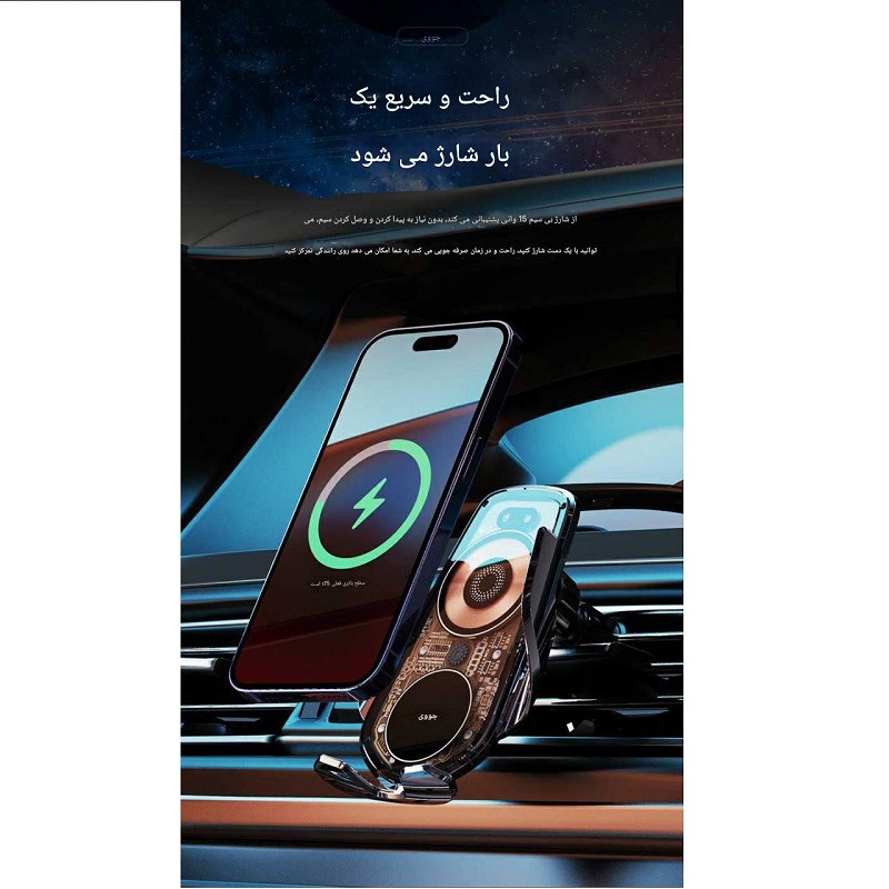هلدر دریچه کولر هوشمند با نورپردازی و قابلیت چرخش ۳۶۰ درجه دارد. این هلدر مخصوص دریچه کولر، انتخابی ایدهآل برای نگهداشتن ایمن و شیک گوشی موبایل در خودرو است. طراحی بسیار نازک بدنه در کنار نورپردازی زیبا، جلوهای مدرن و چشمنواز به فضای داخلی خودرو میبخشد، بهویژه در شب. این هلدر با بهرهمندی از سنسور هوشمند، بهصورت اتوماتیک باز شده و گوشی شما را بهراحتی در جای خود قرار میدهد. قابلیت چرخش ۳۶۰ درجه، امکان تنظیم زاویه دید دلخواه را فراهم میکند. همچنین گیرههای مقاوم طراحیشده برای این محصول، باعث استحکام بیشتر و جلوگیری از افتادن گوشی حتی در مسیرهای ناهموار میشود. با توان ۱۵ وات، این هلدر نهتنها ظاهر زیبا بلکه عملکردی قدرتمند را نیز ارائه میدهد. مناسب برای انواع خودروهایی است که دریچه کولر خطی دارند.