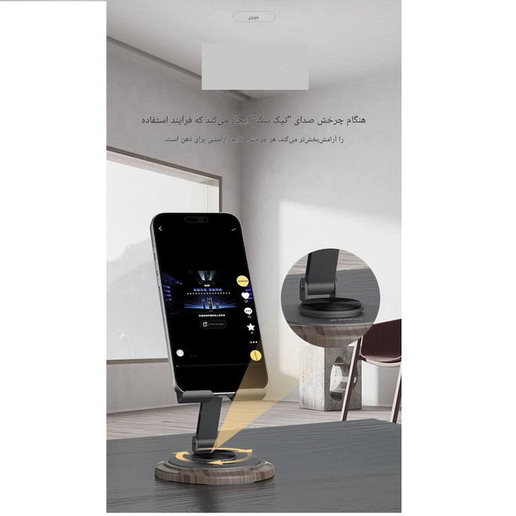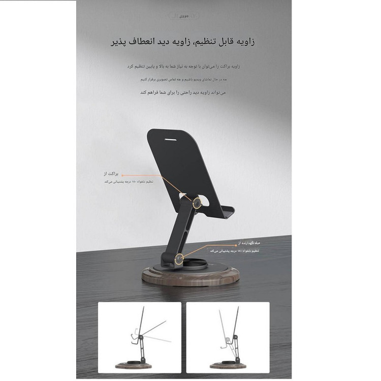 این هلدر رومیزی با طراحی مدرن و پایهای با طرح چوب، انتخابی کاربردی و زیبا برای استفاده روزمره است. بدنه آن از فلز آلومینیوم مقاوم ساخته شده و از قابلیت تنظیم زاویه و چرخش ۳۶۰ درجه پشتیبانی میکند. همچنین امکان تاشدن دارد و حمل و جابهجایی آن را آسان میسازد. برای محافظت بهتر از دستگاه، در بخش پایه و کف هلدر سیلیکون ضدلغزش بهکار رفته که مانع خطخوردگی و لیز خوردن میشود. این هلدر قابلیت انعطافپذیری تا زاویه ۱۸۰ درجه را نیز دارد و استفاده از آن را در شرایط مختلف بسیار راحت کرده است.