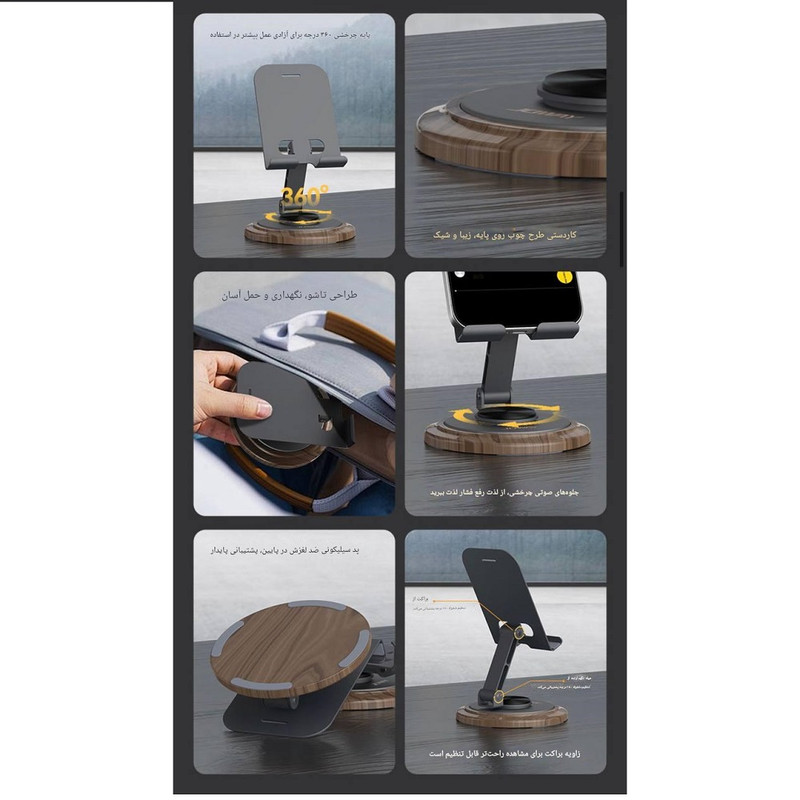 این هلدر رومیزی با طراحی مدرن و پایهای با طرح چوب، انتخابی کاربردی و زیبا برای استفاده روزمره است. بدنه آن از فلز آلومینیوم مقاوم ساخته شده و از قابلیت تنظیم زاویه و چرخش ۳۶۰ درجه پشتیبانی میکند. همچنین امکان تاشدن دارد و حمل و جابهجایی آن را آسان میسازد. برای محافظت بهتر از دستگاه، در بخش پایه و کف هلدر سیلیکون ضدلغزش بهکار رفته که مانع خطخوردگی و لیز خوردن میشود. این هلدر قابلیت انعطافپذیری تا زاویه ۱۸۰ درجه را نیز دارد و استفاده از آن را در شرایط مختلف بسیار راحت کرده است.