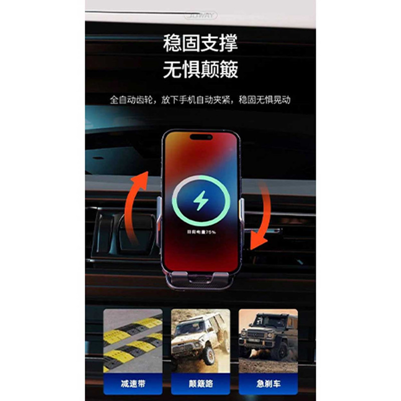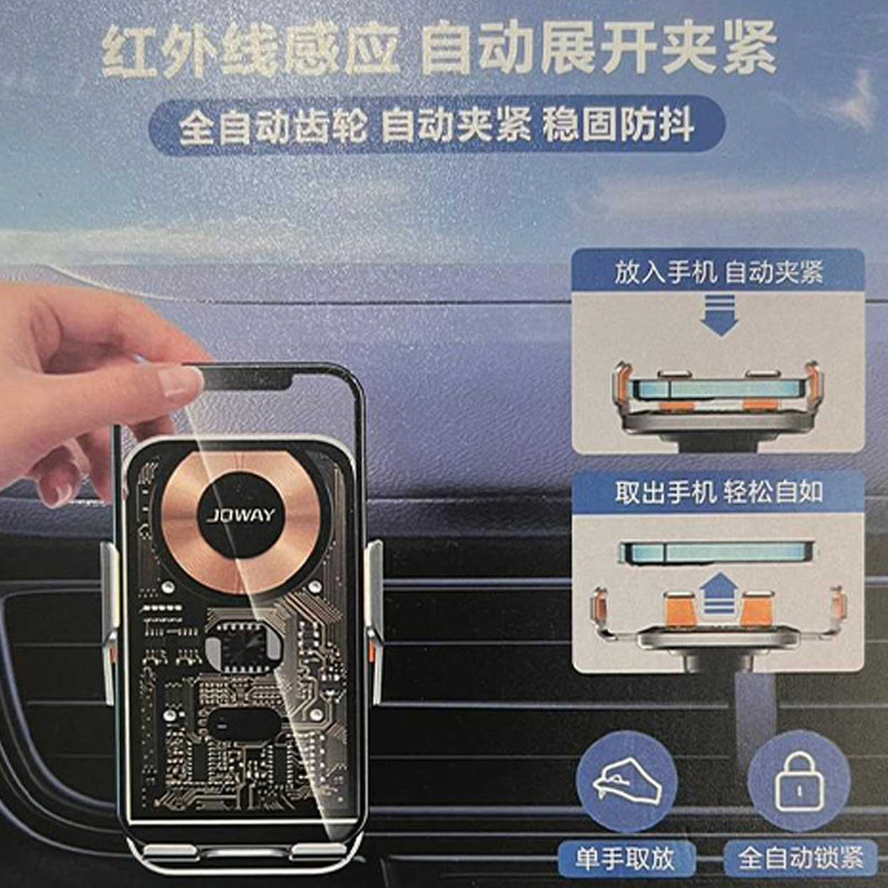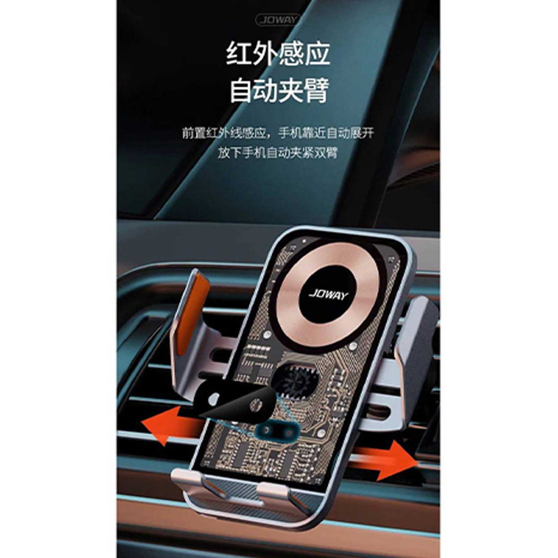 هولدر جووی مدل WXC55 با طراحی و کیفیت بی نظیر خود همه را شیفته خود خواهد کرد.طراحی شیشه ای و لوکس، جنس آلومینیومی، کلید لمسی باز شدن گیره ها و باز شدن مکانیکی و اتوماتیک گیره های کناری هولدر جهت نگه داشتن گوشی از ویژگی های جذاب این محصول میباشد.در کنار این همه جذابیت یک آپشن فوق العاده دیگر هم که شارژ کردن بی سیم گوشی هست رو داره.دکمه پشتی هولدر رو لمس میکنین گیره های به کناره باز میشن گوشی رو که میزارین سر جاش سنسور دستور داده و گیره ها جمع میشن در عین حال هم گوشی رو محکم نگه میداره هم شروع به شارژ کردن گوشی میکنه. داخل خود هولدر یک باطری تعبیه شده که وقتی برق به هولدر وصل نیست همچنان باز و بسته شدن گیره ها کار کنن.برق این هولدر به وسیکه کابل تایپ سی از فندکی یا پورت های USB خودرو تامین میشه و شارژ کردن گوشی تنها وقتی امکان پذیره که برق خود هولدر به فندکی یا منبع تامین وصل بشه.این هولدر به وسیله گیره فلزی که کاملا مهندسی طراحی شده به دریچه کولر وصل میشه و تا زمانی که خودتون گیره رو باز نکنین افتادن هولدر از محل نصب غیر ممکنه مگر اینکه دریچه کولر خودرو بشکنه.