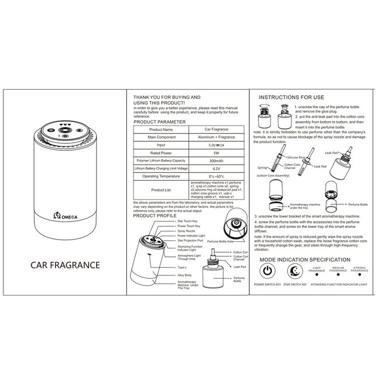خوشبوکننده خودرو و خانه امگا مدل AC50 با طراحی مدرن و قابلیت پخش نور به شکل آسمان پرستاره، یک گزینه جذاب برای ایجاد فضایی آرامشبخش و خوشبو در خودرو یا خانه است. این محصول، علاوه بر خوشبو کردن محیط، با افکت نوری خیرهکننده خود، تجربهای دلپذیر از آسمان شب را به شما هدیه میدهد. 4 مد اسپری این دستگاه هر سلیقه ای را راضی میکند. مد سبک: در 10 دقیقه 1 ثانیه اسپری، مد متوسط: در 5 دقیقه 1 ثانیه اسپری، مد قوی: در 30 ثانیه 1 ثانیه اسپری و مد اسپری مداوم که دستگاه به صورت مداوم اسپری میکند و اتوماتیک بعد از 30 دقیقه خاموش میشود. پورت شارژ دستگاه Taype - C میباشد و ظرفیت باتری آن 300mAh میباشد. اسانس همراه دستگاه نیز بوی ملایمی را دارد که باعث سر درد نمیشود و قابلیت استفاده از هر اسانس دلخواهی بر پایه آب را دارد که با هر سلیقه ای سازگار میباشد.