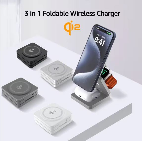 شارژر بیسیم تاشو مغناطیسی 3 کاره Qi2 با توان 25 وات earldom با قابلیت شارژ سریع برای آیفون 16، 15 پرو/مکس/پلاس و اپل واچ 9/8/7/6/5