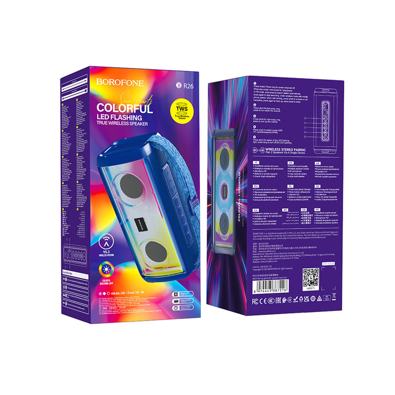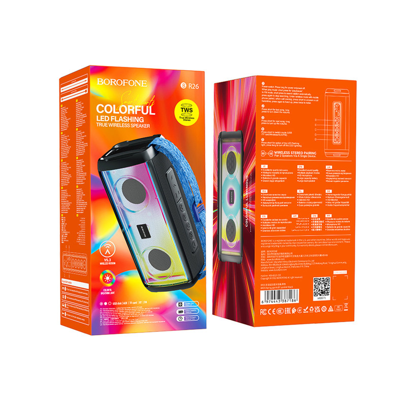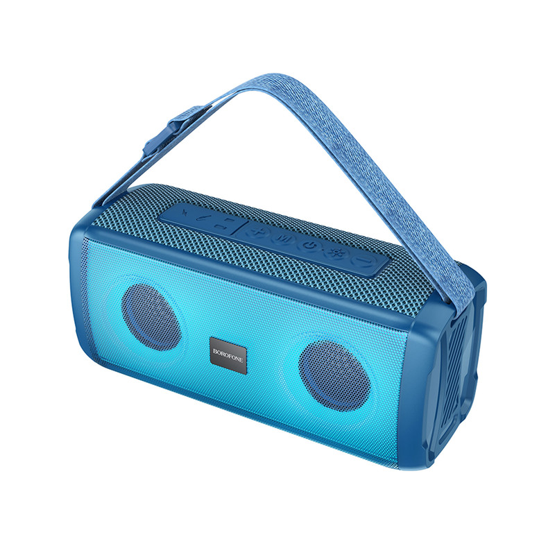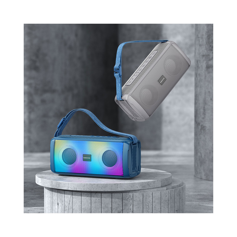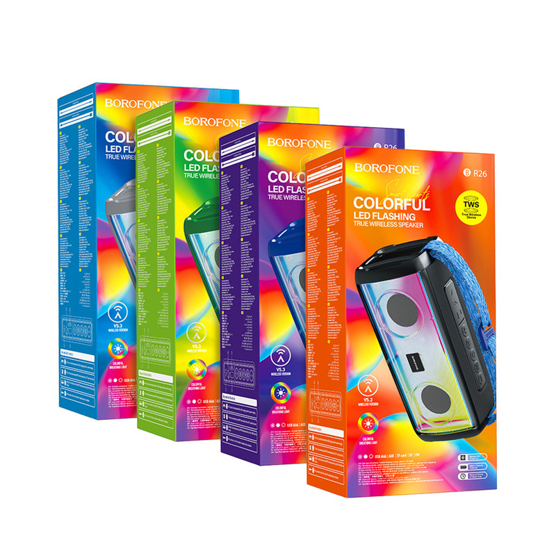 اسپیکر بلوتوثی borofone بروفون مدل BR26 طراحی شده کلید کنترل پخش موسیقی PLAY BACK/PUSE/NEXT/PEV به روی اسپیکر قابلیت استفاده از رادیو FM دارای افکت نور فرکانس انتقال: ۲.۴ گیگاهرتز فرکانس پاسخدهی: ۲۰-۱۲۰ کیلوهرتز دارای گواهینامه QC PASS جهت تایید بررسی و آزمونهای کیفیت سنجی دارای تمام استانداردهای بینالمللی