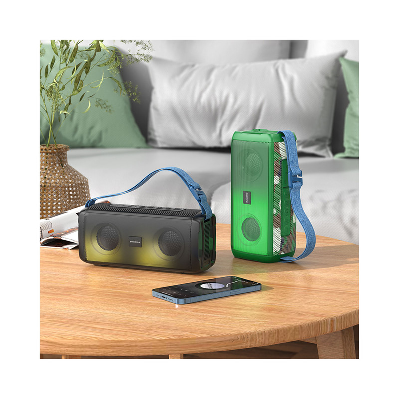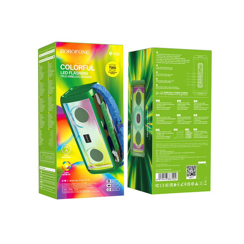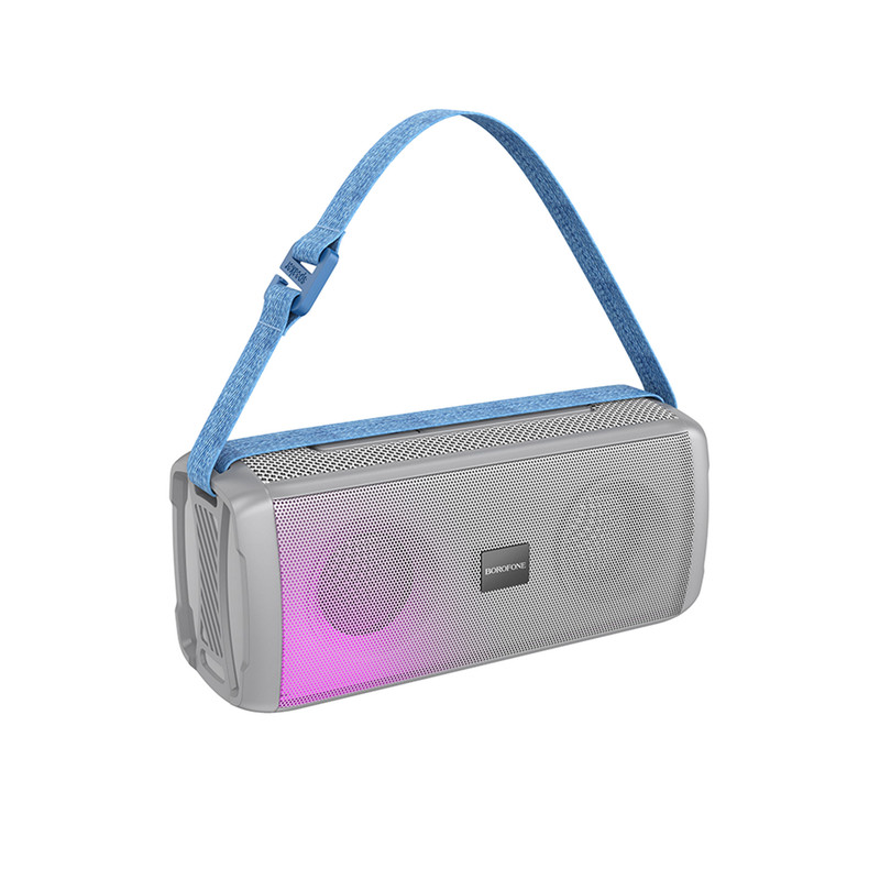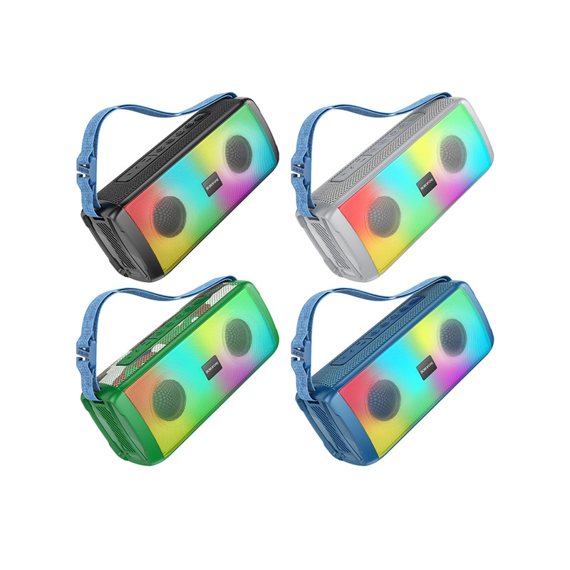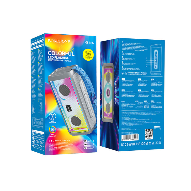 اسپیکر بلوتوثی borofone بروفون مدل BR26 طراحی شده کلید کنترل پخش موسیقی PLAY BACK/PUSE/NEXT/PEV به روی اسپیکر قابلیت استفاده از رادیو FM دارای افکت نور فرکانس انتقال: ۲.۴ گیگاهرتز فرکانس پاسخدهی: ۲۰-۱۲۰ کیلوهرتز دارای گواهینامه QC PASS جهت تایید بررسی و آزمونهای کیفیت سنجی دارای تمام استانداردهای بینالمللی