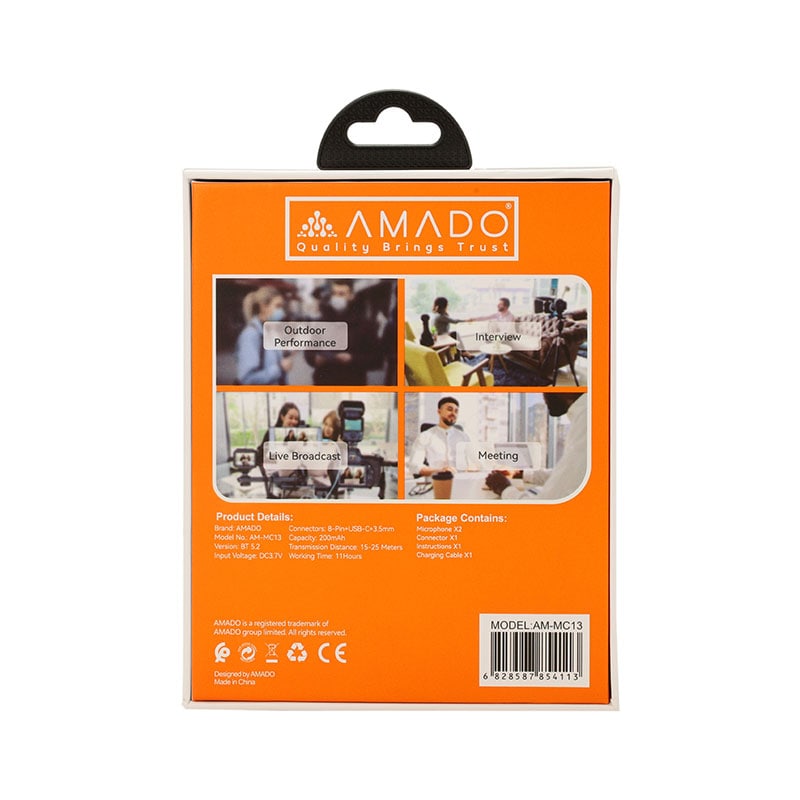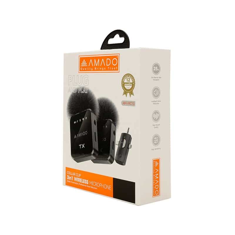 میکروفون بی سیم آمادو amado یقهای 3 در 1 مدل MC13 یک میکروفون همهکاره و با کیفیت بالا است که برای ظبط صدا در شرایط گوناگون طراحی شده است. این میکروفون با ویژگیهای منحصر به فرد، گزینهای ایدهآل برای تولیدکنندگان محتوا، خبرنگاران و افرادی است که به تولید محتوا و ظبط صدای حرفهای با کیفیت بالا نیاز دارند.