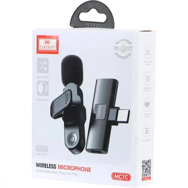 میکروفون بی سیم Earldom Type-C مدل MC7C دارای توری ضد باد، نشانگر میکروفن، پورت شارژ میکروفن، گیره میکروفن، کلید سوئیچ، پورت برای اتصال تلفن، نشانگر گیرنده، پورت گیرنده، سوراخ طناب می باشد.